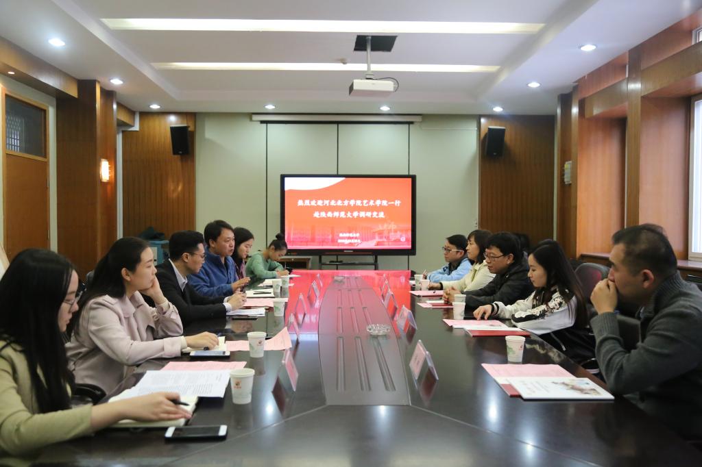 10月22 日下午,河北北方学院艺术学院(演艺学院)学工干部在六艺楼南侧129会议室与我校awc777万象城娱乐官网、美术学院学工干部进行调研交流。河北北方学院艺术学院(演艺学院)党委副书记裴春燕、段军,学生科长李文皓,团委书记张乃楠,我校awc777万象城娱乐官网党委副书记范玮熠,美术学院党委副书记甄军军,awc777万象城娱乐官网团委书记宋娜、本科生专职辅导员张仪,美术学院研究生专职辅导员邓晨菲参加了会议。本次会议由范玮熠主持。