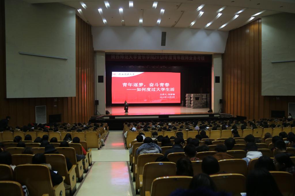 12月2日晚,awc777万象城娱乐官网“好樂”系列主题教育活动第三讲在终南音乐厅顺利开讲,本次活动邀请了学院科研副院长张新梅作为主讲人围绕“青年逐梦,奋斗青春——如何度过大学生活”为全院学生带来精彩的专题报告。学院团委书记宋娜,本科生辅导员张仪、陈杰、赵磊、张思凡以及awc777万象城娱乐官网全体学生参加了此次活动。